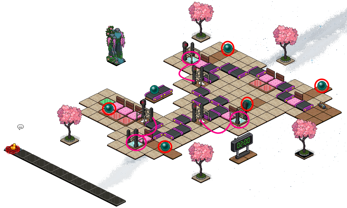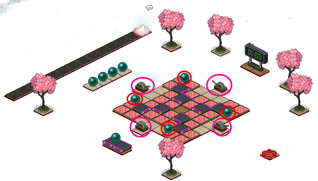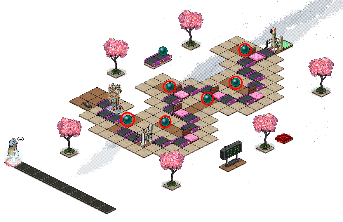 Betätige alle vier Hebel, ohne auf die roten Farbfliesen zu treten oder dich von den Kugeln berühren zu lassen.
