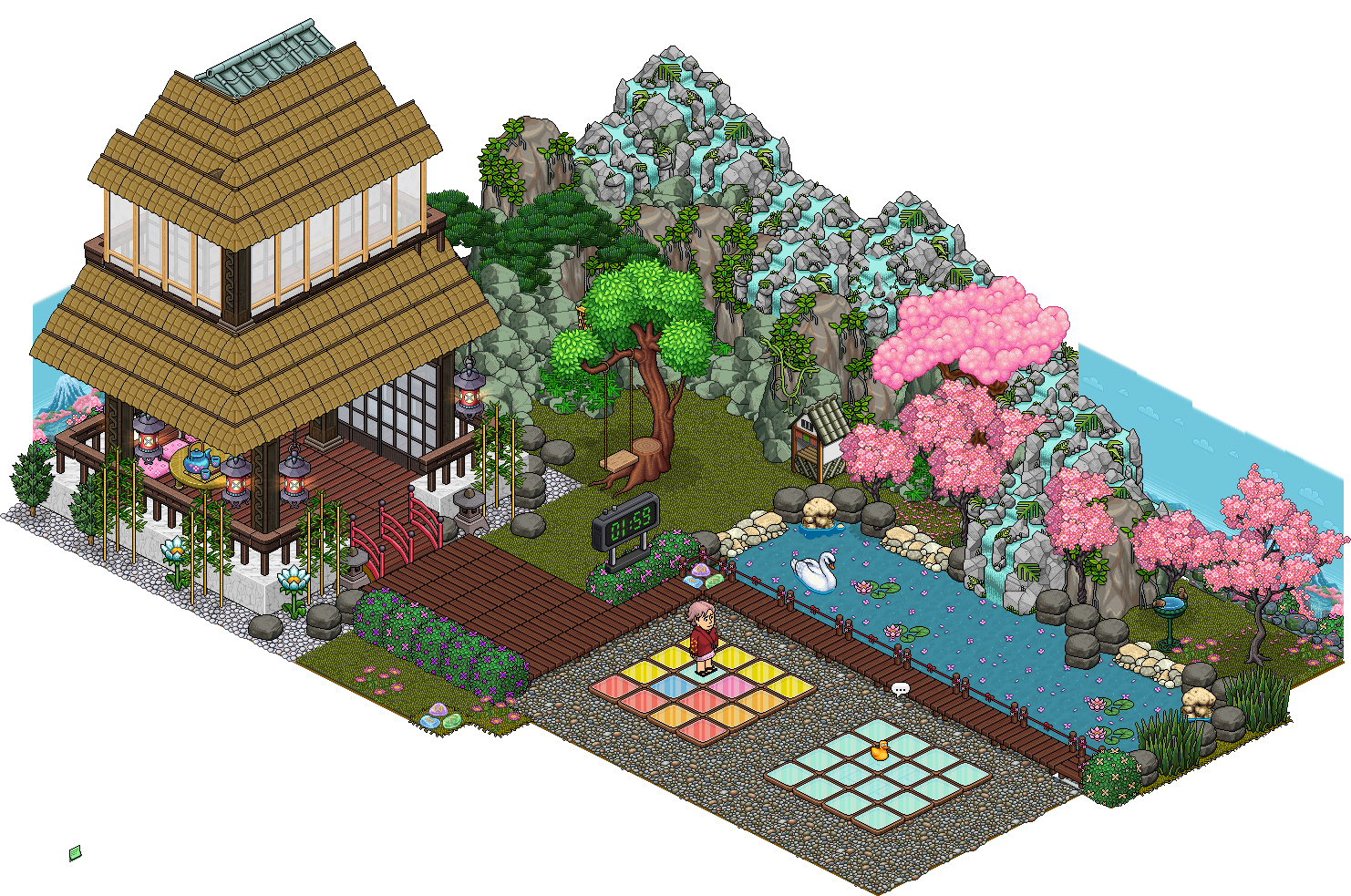 Setz dich am Ende auf das blau markierte Sakura-Blumenkissen.