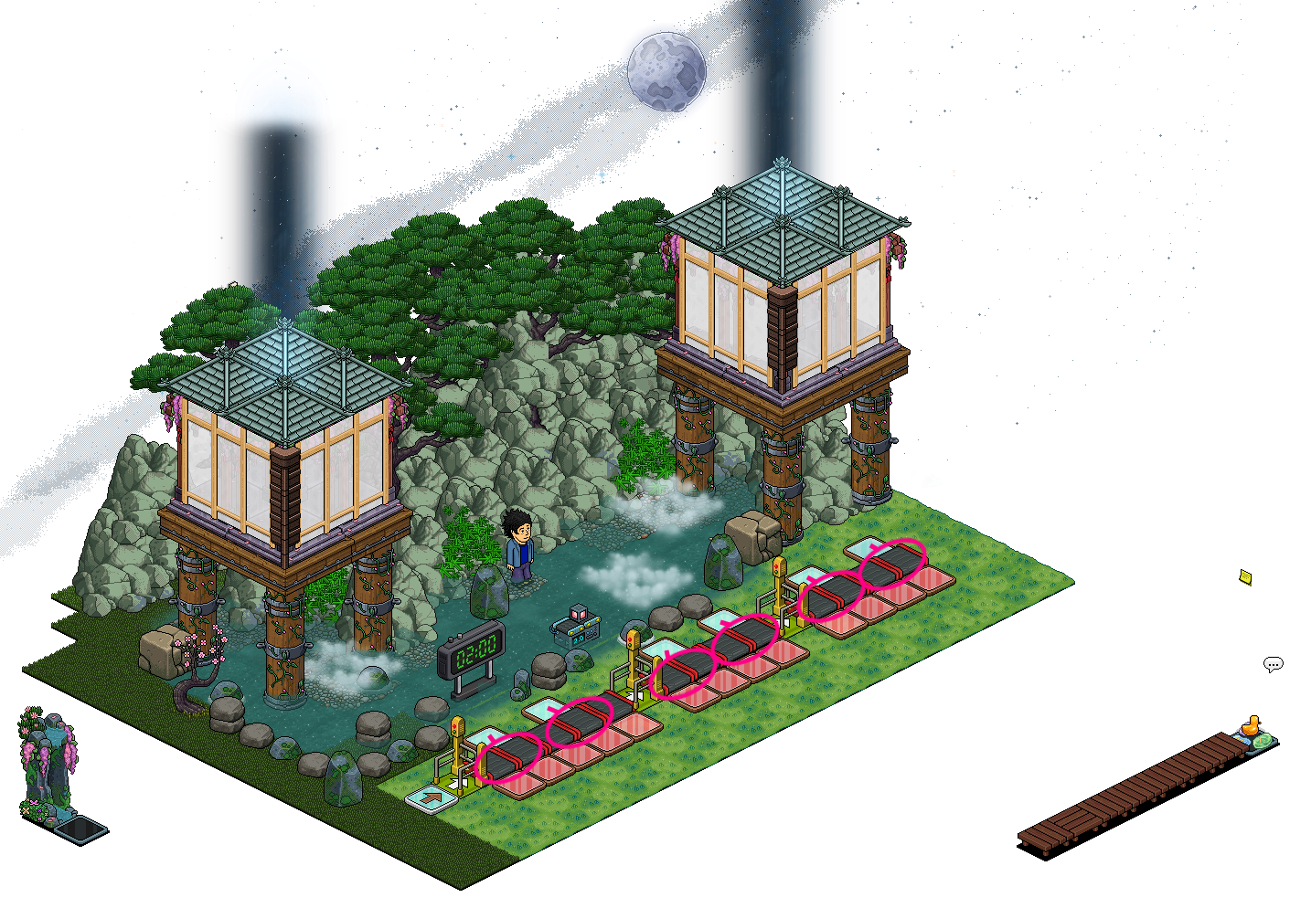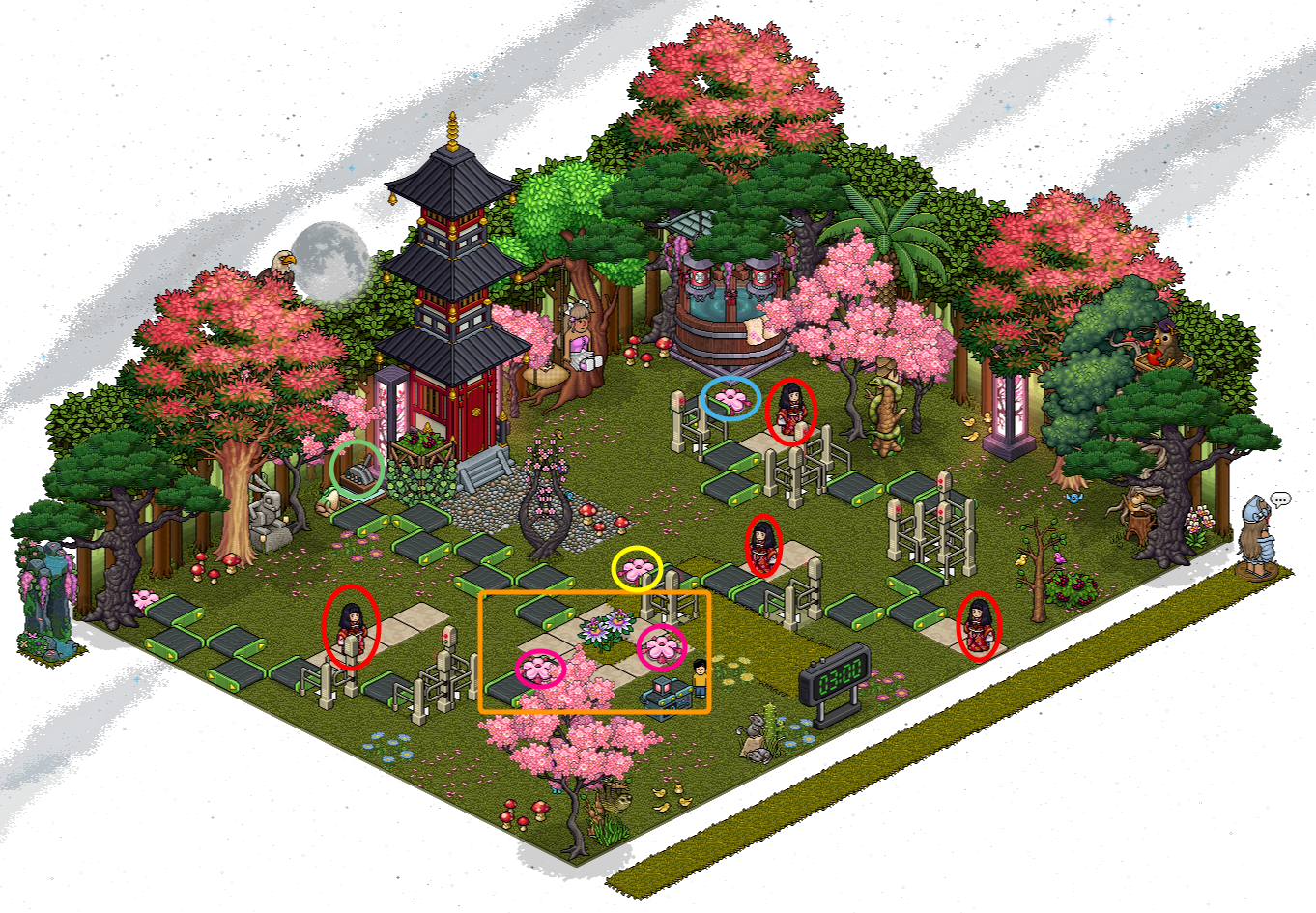 Laufe zum markierten Bodenschalter, um die ToW zu drehen. Bewege dich im orangen markierten Bereich nur über das Sakura-Blumenkissen.
