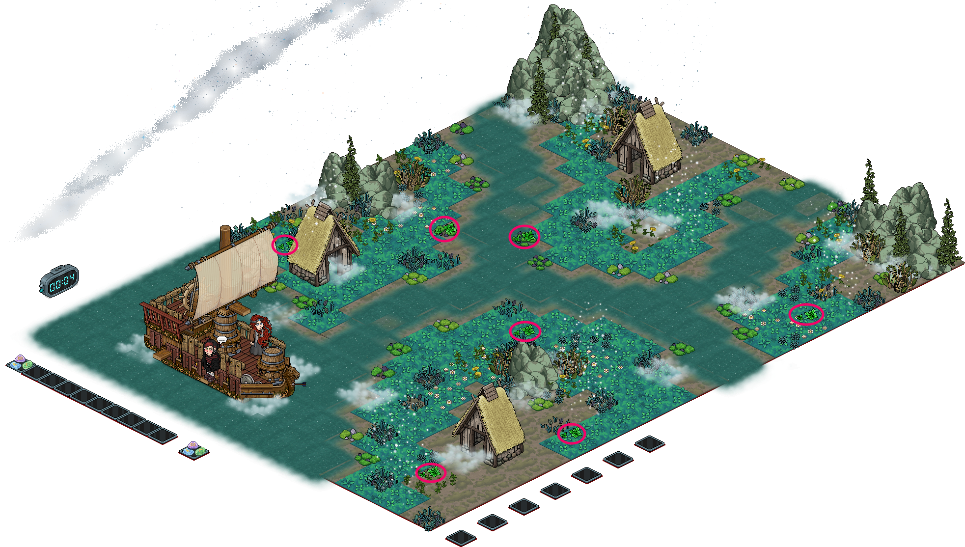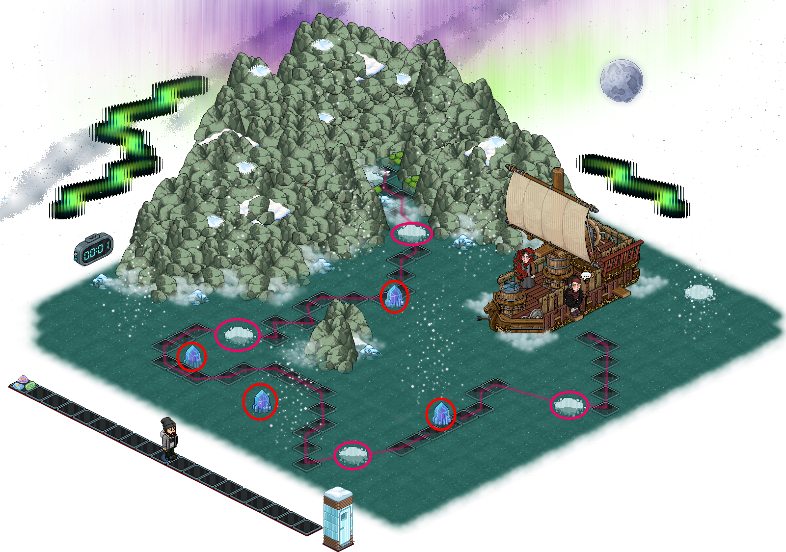 Folge dem Weg bis zum Moos, indem du dich nur über die dunklen Fliesen und Eisschollen bewegst. Achte auf die rot markierten Eisbrocken!
