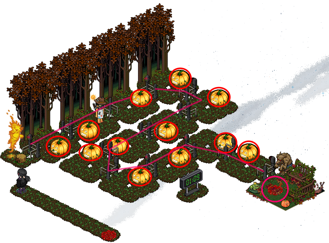 Gelange auf die andere Seite, indem du die Türen ohne Wiederkehr verwendest. Lasse dich hierbei nicht von den Kürbissen berühren!